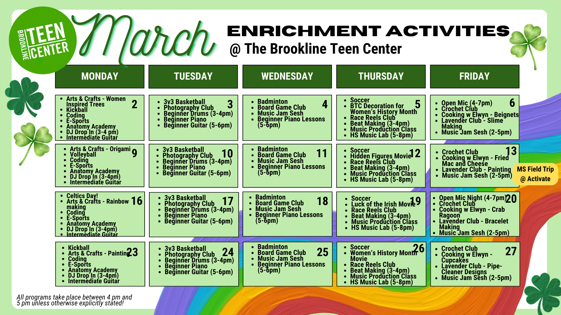 This Friday, our middle school students will be going to Activate in South Bay from 2-6 pm. If you would like to join us, sign up on the wellnessliving app or let a BTC staff member know.